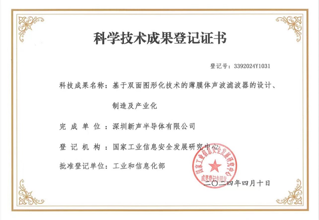 2024年4月,新声半导体创新科技成果“基于双面图形化技术的薄膜体声波滤波器的设计、制造及产业化”荣获由工业和信息化部国家工业信息安全发展研究中心颁发的“科学技术成果登记证书”。这一荣誉不仅彰显了新声半导体在体声波滤波器技术领域的卓越成就,更是对企业科技核心竞争力和技术创新性及领先性的权威认可。